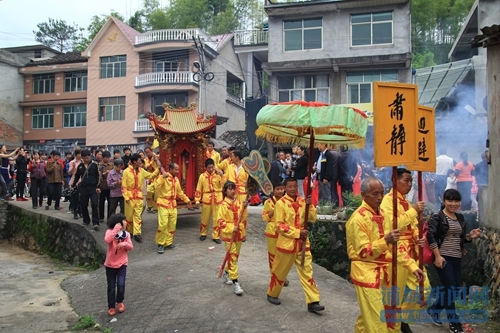 媽祖“巡村”有講究 媽祖“巡村”很有講究,出巡時(shí)至少要60人才能上路,需要全幅鑾駕,即鑾傘一把、“天上圣母”街牌、“肅靜”牌、“回避”牌,以及玉斧、大刀、畫戟等12種兵器組成的器械儀仗,紅旗六面,護(hù)身童子一對(duì)(男童叫千里眼、女童叫龍女),鑼鼓手等樂隊(duì)兩套。隊(duì)伍服裝要有紅藍(lán)黃灰青五種色;出行時(shí)不能戴斗笠;參與活動(dòng)的村民要衣裝整潔,而且品行好,抬媽祖轎、護(hù)身童子的必須是父母雙全、兄弟姐妹間團(tuán)結(jié)和睦、德高望重的村民;抬香爐的則要求是忠厚老實(shí)的村民。