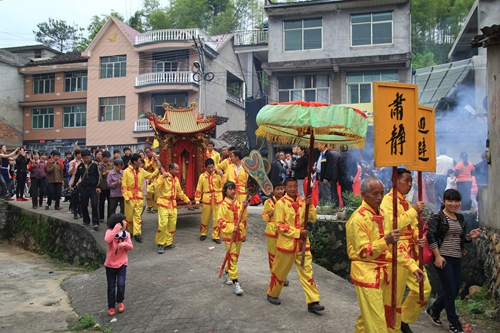 大山深處有“海神”。富嶺鎮(zhèn)前洋村遠(yuǎn)離大海、四面環(huán)山,但在5月10日,即媽祖誕辰到來前,前洋村上演了祭拜媽祖的精彩一幕。身穿各色衣服的村民們拉起長達(dá)兩、三百米的隊(duì)伍,敲鑼打鼓放鞭炮,抬著“媽祖轎”,繞著村子走。中途停留之處,村民們便擺起香案、點(diǎn)燃火堆,跪下拜媽祖,然后拿起香緊隨在隊(duì)伍的后面。 前洋的媽祖文化已傳承了千年,村里的老人告訴說,每年在媽祖誕辰之日的前后,村里便會(huì)舉行“媽祖巡村”、搭戲臺(tái)演唱地方戲、千人共吃團(tuán)結(jié)飯等民俗文化活動(dòng),以前長達(dá)半個(gè)月,現(xiàn)在為三天,附近的上橋、圳邊、高坊、大水口、雙同等十多個(gè)村的村民都參與。