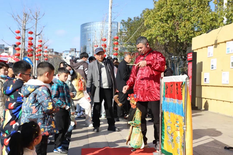 木偶戲表演。周文倩 攝 2月5日下午,浦城縣在丹桂城市廣場開展了“文化進萬家 ?;①R新春”活動,為市民朋友帶來了一場文明盛宴。 活動中,120條與詩詞文化、浦城歷史文化等主題有關的謎語懸掛在燈籠吊穗上供市民競猜,一個個喜慶的紅燈籠,一條條有趣的謎語引起了大家濃厚的興趣。在一條條謎語前大家駐足思索、絞盡腦汁,大顯神通。猜謎現場有的家人協作,有的三五成群一起討論,破解謎底,不一會,一條條謎語都被解答出來,人群中還不時爆發出贊嘆和驚呼。猜對的越戰越勇,一鼓作氣猜下一個謎語,沒猜對的也毫不氣餒,繼續開動腦筋?;顒蝇F場一片歡聲笑語,氣氛十分熱烈。