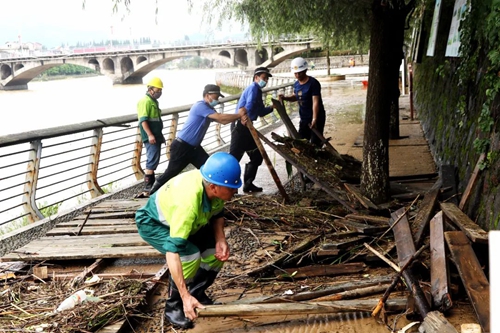 在清水慢道搬運清理毀壞的設施 “我們共出動63人、4輛消殺車,對城區內12條主次干道積水點、公園廣場和29座公廁、7座中轉站等環衛設施進行全面消殺,對淤泥、垃圾、石塊及雜物等進行加急清理,確保汛后城區主次干道環境衛生干凈整潔。”縣城市管理局局長余愛國說,縣城管局還安排市政人員對損毀道路、照明設施和道路護欄進行全面排查修復。