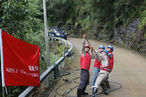 浦城供電優秀共產黨員劉禮標(前一)帶隊巡線路上 哪里有困難,哪里就有黨員的身影。該公司水北街、永興、富嶺等供電所黨員干部以身作則,做好防汛抗洪搶險復電。水北街供電所黨員干部帶頭夜間冒雨對10千伏水北線線路倒桿進行搶修;富嶺供電所對10千伏浮流線線路設備開展隱患排查整治,對路基旁的桿塔基礎進行培土加固、開挖排水溝,避免山洪暴發對桿塔基礎造成傷害;永興供電所搶修人員開展10千伏古上線巖坑支線10號桿斷線及更換絕緣導線作業提升線路健康水平。