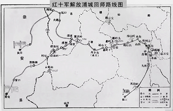 紅十軍解放浦城回師路線圖(來源:浦城縣博物館) 會后,方志敏親自帶領宣傳隊在浦城街頭宣傳。浦城群眾聽到“大救星”方志敏到來,紛紛走出家門,涌向街頭聽他演講,會場人山人海,氣氛非常熱烈。方志敏語言清晰、說理透徹,黨的政策,句句打動人心,廣大群眾聽得熱血沸騰。縣城百姓紛紛起來幫助紅軍。有的帶路捉土豪,有的幫助搜索喬裝藏匿的國民黨兵。中午時分, 縣城各商店都開門照常營業,市民們喜氣洋洋,城市秩序井井有條。