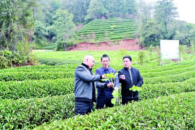 科技特派員劉國英(中)和徐茂興(右一)在燕子窠生態茶園為茶農講解茶園套種油菜的好處。邱汝泉攝/光明圖片