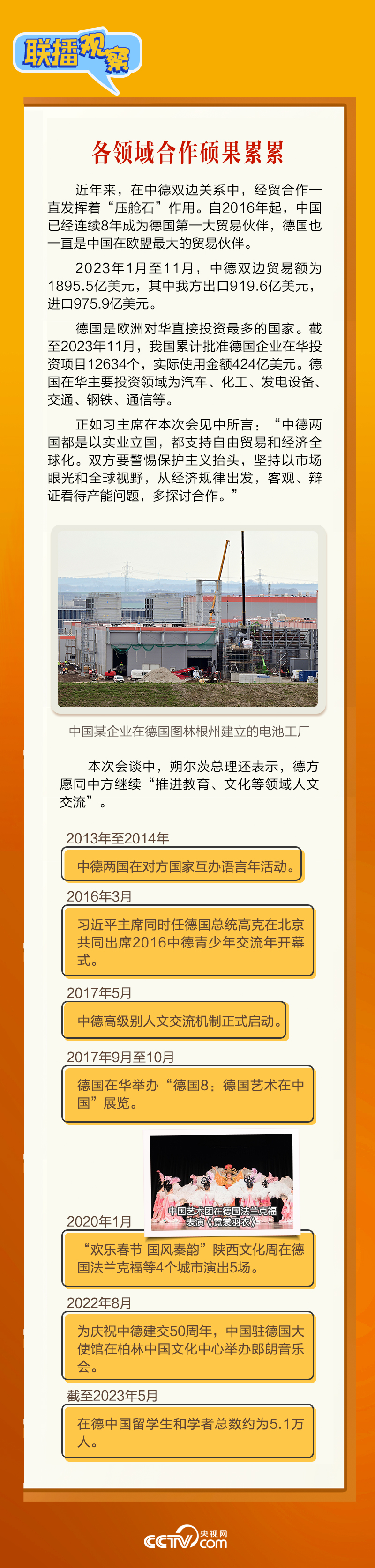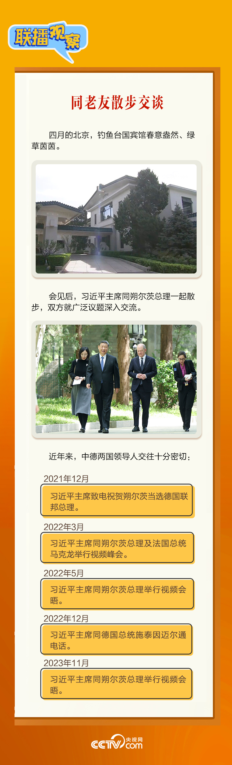 4月14日至16日,德國總理朔爾茨對(duì)中國進(jìn)行正式訪問。這是朔爾茨就任德國總理以來第二次訪華,他也是今年首位訪華的西方大國領(lǐng)導(dǎo)人。 4月16日上午,習(xí)近平主席在北京釣魚臺(tái)國賓館會(huì)見朔爾茨總理。會(huì)見中,習(xí)主席強(qiáng)調(diào),要“牢牢把握中德是全方位戰(zhàn)略伙伴這一定位”。中德建立全方位戰(zhàn)略伙伴關(guān)系10年來,兩國如何共同發(fā)展,相互成就?央視網(wǎng)《聯(lián)播觀察》帶您了解。