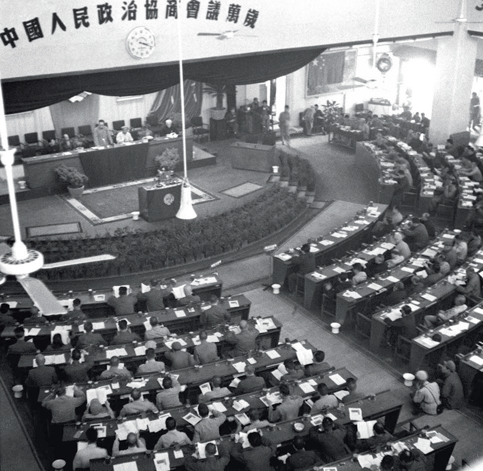 中國人民政治協商會議第一屆全體會議會場。圖源:共產黨員網 1952年2月5日,郭沫若、胡愈之等在中國文字改革研委會上也提出了中文“必須自左而右地橫行”的建議。 在這些著名人士的共同推動下,1955年1月1日,《光明日報》將豎排版改變為橫排版,率先試行漢字由從上到下的豎排,改為從左到右的橫排印刷。