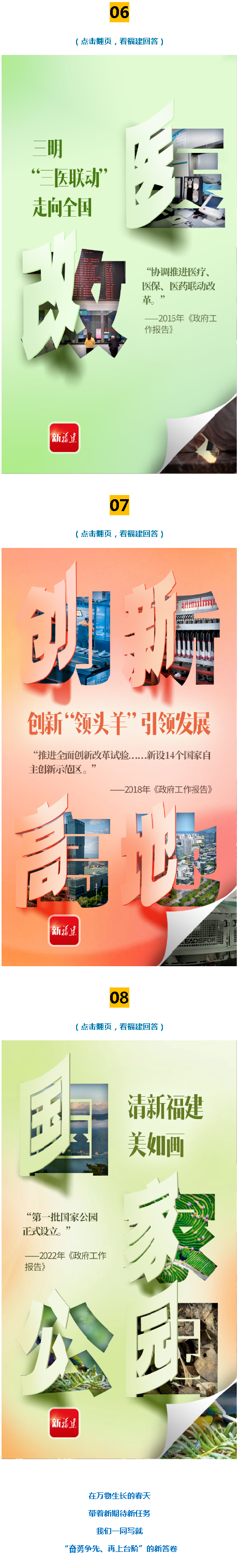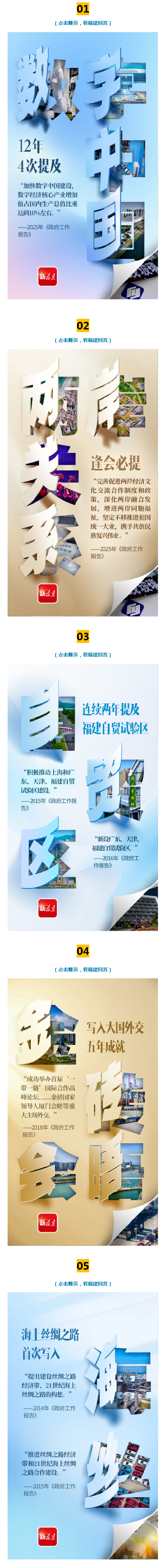 今天上午 十四屆全國(guó)人大三次會(huì)議開(kāi)幕 2025年《政府工作報(bào)告》中 “民營(yíng)經(jīng)濟(jì)”“自貿(mào)試驗(yàn)區(qū)”“數(shù)字經(jīng)濟(jì)”等 福建人熟悉的字眼頻頻出現(xiàn) 其實(shí) 黨的十八大以來(lái) 12次的《政府工作報(bào)告》 曾多次提及福建 肯定福建成績(jī)的同時(shí) 也提出新的工作要求 以一域之光,為全局添彩 今天 一同打開(kāi)這些福建發(fā)往北京的明信片 看看福建的回答 福建日?qǐng)?bào)社全媒體傳播中心出品 資料來(lái)源:國(guó)務(wù)院《政府工作報(bào)告》、《福建日?qǐng)?bào)》、健康中國(guó)微信公眾號(hào)等 制圖:陳羽晶 |