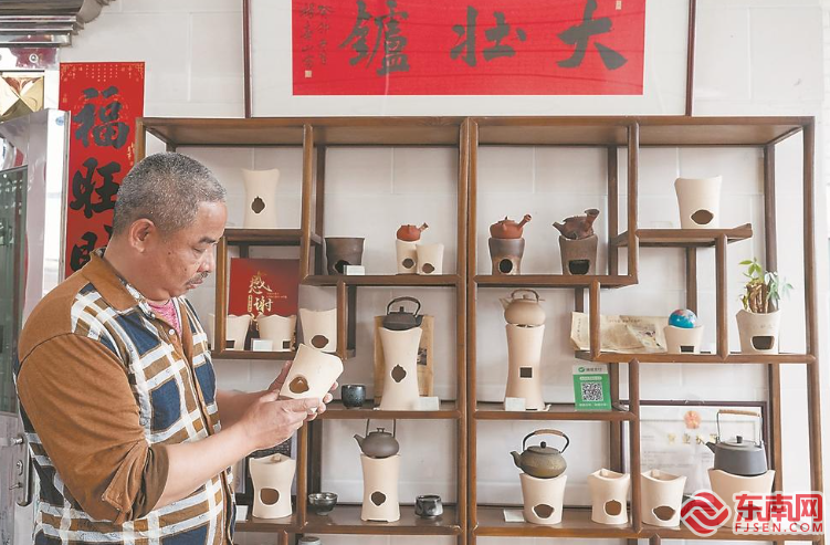 在許英森家里,有一架子的大壯爐,都是近幾年各地客戶訂購的樣品。 東南網3月24日報道(福建日報記者 王毅 通訊員 藍毅輝 文/圖) 喝茶之人常說:“茶必武夷,壺必孟臣,杯必若琛。”若是到了閩南和潮汕地區就得再加一句:“爐必大壯。” 這些沉淀著工匠精神的茶器,讓人們在品茗時獲得了物質和精神的雙重享受。 大壯爐形似元寶,高筒細腰,爐口翹起三片飛翼,飛翼結構可最大限度保證火苗與茶爐的接觸。 大壯爐的第一代創始人許大壯生活于清康熙年間南靖馬坪(今龍海程溪鎮人家村一帶),以制爐著名。據康熙《漳州府志》記載:“茶爐,出馬坪,以白土為之,其色如施粉,風口刻花,工致異常,前此未有也。” 漳州市龍海區程溪鎮人家村的許英森是漳州大壯爐傳統制作技藝第十二代傳承人。今年1月,他入選第五批龍海區區級非物質文化遺產代表性傳承人。 早在明末,大壯爐就被運至龍海海澄月港,再經大船漂洋過海,行銷全國乃至東南亞,尤其在清光緒年間,大壯爐銷往日本,大受歡迎。隨著電爐的出現,大壯爐的傳統制作技藝逐漸失傳。2014年,當日本客商尋找大壯爐聯系到許英森時,他發現手工炭爐的市場在慢慢復蘇,就算在本地也有不小的需求。 今年56歲的許英森自小跟著父親學習馬坪茶爐制作,他與妻子許珠珍將工作室安置在自家樓頂。根據記憶與實物,許英森在很短的時間里就復原了祖上大壯爐的制作技藝,“當時訂購的數量雖然不多,但手工制作花了好幾個月”。 “只要原料還在,我就能做出當年的大壯爐。”許英森告訴記者,人家村特有的高嶺土是大壯爐的配方關鍵,以此為原料搭配一定比例的砂泥,制作出的大壯爐經久耐用,經歷炭火高溫而不裂。 既然開爐,就不能只是做幾次買賣,要把技藝不斷傳承下去。在兒子許鳴山的幫助下,許英森開啟了關于大壯爐的網絡推廣賬號。 “沒想到很多人發私信問我,真的還有在制作這么傳統的炭爐嗎?”許英森搓著滿是泥灰的雙手憨笑著說,“很多年輕人下單購買,還有特意上門探訪拍攝的。” 在自家樓頂簡易的雨棚下,許英森和許珠珍一個人揉土,一個人修坯,邊上的電窯爐正燒制著四五個小號的大壯爐。在申報區級非遺成功后,許英森注冊了大壯爐商標,每一個親手制作的爐子上他都會打上印章,“現在村里還在做爐子的就我一家了,我力求將每一個爐子制成精品,讓每一個享受傳統炭爐煮茶樂趣的人滿意,也能對得起有幾百年歷史的馬坪茶爐口碑”。