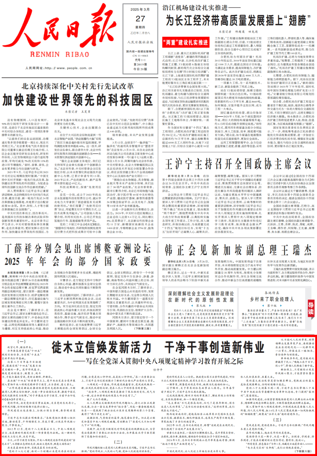 《人民日?qǐng)?bào)》今日推出任仲平文章《徙木立信煥發(fā)新活力 干凈干事創(chuàng)造新偉業(yè)——寫(xiě)在全黨深入貫徹中央八項(xiàng)規(guī)定精神學(xué)習(xí)教育開(kāi)展之際》。文章指出,中央八項(xiàng)規(guī)定是新時(shí)代制定的第一部重要黨內(nèi)法規(guī)。這一新時(shí)代的徙木立信之舉,改變中國(guó)。而今邁步從頭越。以八項(xiàng)規(guī)定催發(fā)更深層次的化學(xué)反應(yīng),以中國(guó)共產(chǎn)黨之治引領(lǐng)中國(guó)之治,我們必將創(chuàng)造新的更大奇跡。