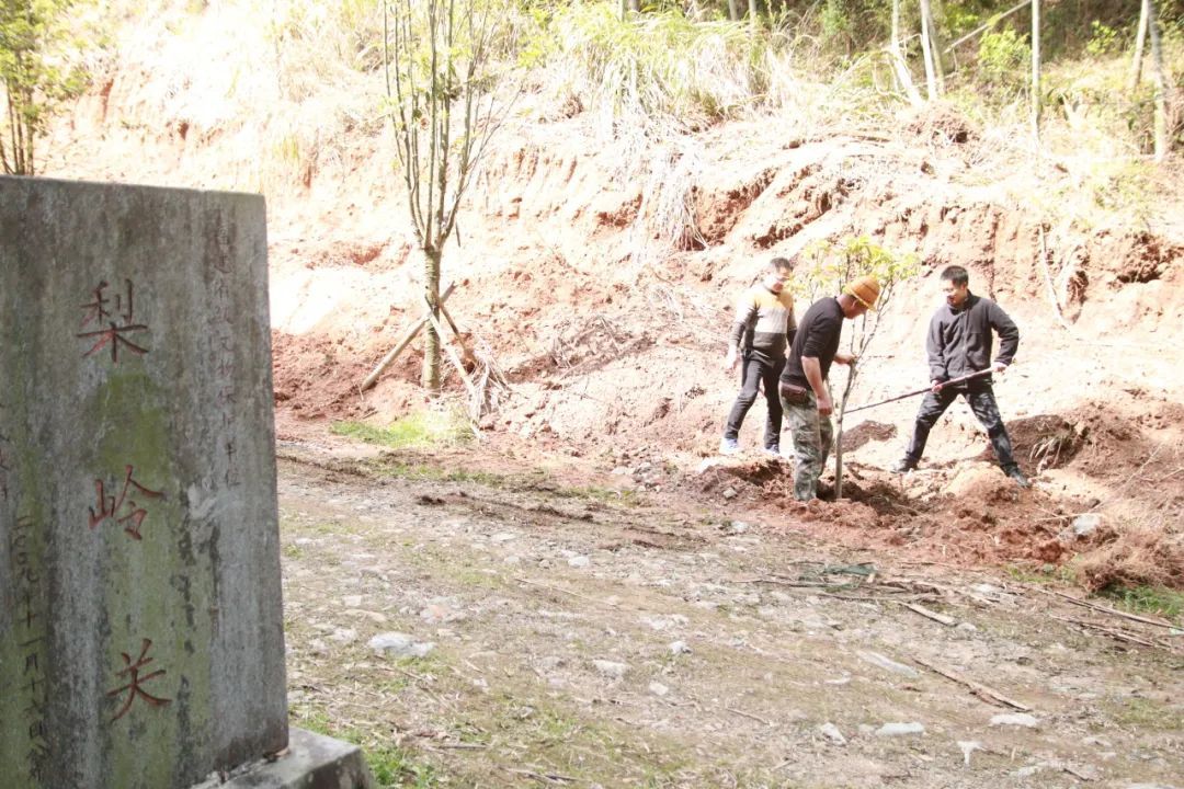植樹現場 植樹現場,一片熱火朝天的景象。大家熱情高漲,分工明確,配合默契。有的揮鍬鏟土,動作嫻熟有力;有的小心翼翼地扶苗填坑,每一個環節都做得認真細致。在大家共同努力下,原本空曠的土地上,整齊地排列著一棵棵充滿生機的梨樹苗與桂花樹苗,它們在春風中輕輕搖曳,仿佛在訴說著對未來的憧憬。本次植樹活動共種植梨樹和桂花樹10畝,約360株。 唐貞元七年(791年),林藻與其弟林蘊聯袂進京趕考,在梨嶺嶺頭各折桂題詩:“曾向嶺頭題姓字,不穿楊葉不言歸。弟兄各折一枝桂,還向嶺頭聯影飛。”故而又稱“折桂嶺”。梨樹開花時,千朵萬朵素潔淡雅,玉骨冰肌有“占斷天下白,壓盡人間花”之氣勢;桂花則以其馥郁的芬芳聞名遐邇,更為梨嶺關增添一份獨特的韻味與浪漫氣息。展望來年,梨嶺關必將迎來一幅美不勝收的景象:春季,梨樹開花,滿樹潔白,如同雪花漫天飛舞;秋季,丹桂飄香,沁人心脾,梨樹枝頭果實累累,壓彎了枝頭。