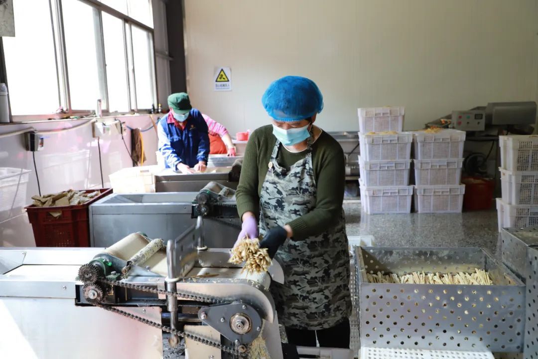筍干加工 “村里每家每戶都有山,春筍一出,大家都回來做筍干,一年能有2萬元左右的收入。”小溪村黨支部書記祝德平,山下筍干歷史悠久,小有名氣,但是,長久以來“各自為戰”,加工品質不一、附加值低、銷售模式簡單等問題成為了制約產業發展的難題。 為破解這一難題,小溪村黨支部發揮“雙領辦”機制的作用,成立了由村集體與村民共同持股、共享收益的浦城縣山下農林綜合開發有限責任公司,盤活村里閑置的竹器廠,建起了標準化生產廠房,提高制作和加工筍干的效率和水平。去年,公司獲得了生產加工許可證并開始試運營,聘請了高校教授、科技特派員入駐公司指導如何規范生產、做好食品包裝,因村里姓氏以“祝”和“毛”為主,注冊了“竹茅”商標,注冊的浦城縣山水竹韻電子商務有限公司,還獲評首屆“福建省鄉村振興樣板直播間”。“為進一步規范生產、擴大產能,目前,我們正在籌劃使用爭取到的省級鄉村振興示范村項目資金擴建廠房、升級設備。”祝德平對未來的發展信心滿滿。