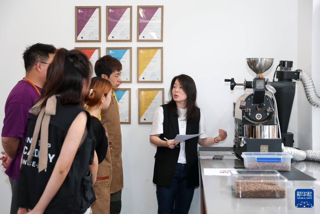 在一尺見學咖啡培訓學校,咖啡烘焙師蔡曉麗為學員講解咖啡烘焙技巧(5月22日攝)。 上海是全國咖啡門店數(shù)量最多的城市,咖啡文化早已融入這座城市的肌理。從繁華的市中心商圈到寧靜的鄉(xiāng)村,咖啡店的業(yè)態(tài)融合正成為一種新趨勢。其中,“咖啡+自然+文化”的創(chuàng)新模式,成為眾多上海咖啡門店的選擇,為文旅消費注入了強勁的新動力。 新華社記者 王翔 攝