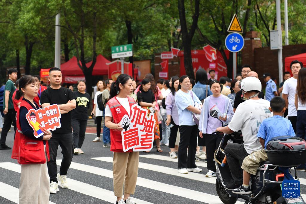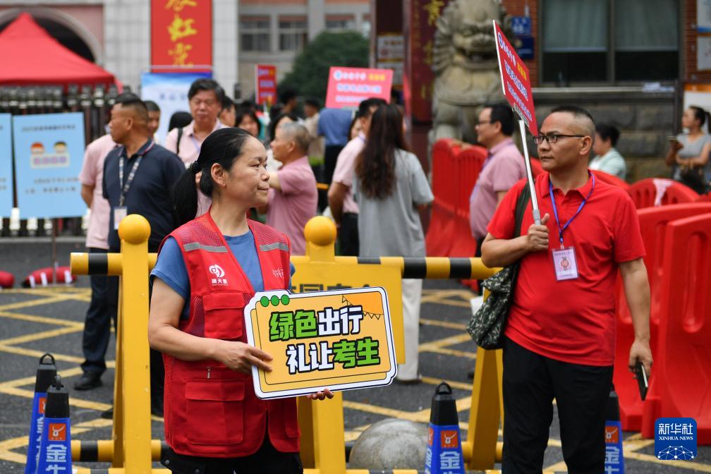 6月8日,志愿者在湖南省天心考區明德中學考點外維持秩序。 2025年全國高考期間,長沙市天心區組織青年志愿者,在多個考點為考生和家長提供便利服務。 新華社記者 陳振海 攝