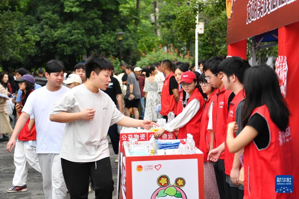 6月8日,志愿者在長郡湘府中學考點為考生提供飲用水。 2025年全國高考期間,湖南省長沙市天心區組織青年志愿者,在多個考點為考生和家長提供便利服務。 新華社記者 陳振海 攝