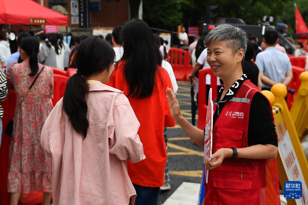 6月8日,志愿者在湖南省天心考區明德中學考點外引導考生入場。 2025年全國高考期間,長沙市天心區組織青年志愿者,在多個考點為考生和家長提供便利服務。 新華社記者 陳振海 攝