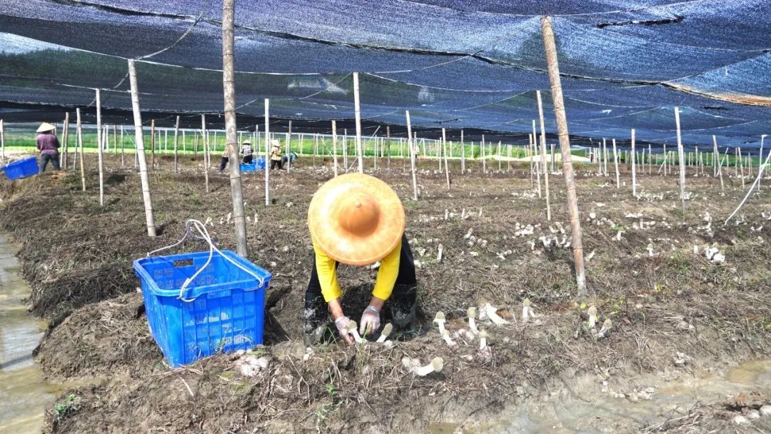 山后村駐村第一書記李柯楠與村民查看竹蓀長(zhǎng)勢(shì) “這竹蓀菌柄挺直、菌裙舒展,今年雨水足、管護(hù)細(xì),一壟壟長(zhǎng)得真旺實(shí)!”山后村駐村第一書記李柯楠捧著雪白的竹蓀說。他身處的竹蓀基地里,新冒出的菌蕾正頂著泥土舒展。 清晨6點(diǎn)至10點(diǎn),是竹蓀采摘的“黃金窗口期”。村民們戴著手套的雙手在菌壟間穿梭如靈動(dòng)的琴弦,指尖輕觸菌柄基部,手腕微旋,便將整株竹蓀連根帶土收入竹籃——這套經(jīng)過百次練習(xí)的“采摘三重奏”,既能避免指紋損傷菌裙,又能完整保留菌托的營(yíng)養(yǎng)價(jià)值。 竹蓀產(chǎn)業(yè)的興旺,實(shí)實(shí)在在地鼓了村民的腰包。“這段時(shí)間天天忙著采竹蓀,雖然辛苦,但是心里高興,不僅能掙錢,還能照顧家里。”采摘工人托著剛摘下的竹蓀笑著說。據(jù)統(tǒng)計(jì),僅采摘季,種植基地就吸納周邊200余名村民務(wù)工,一天人均增收100余元。此外,竹蓀種植還帶動(dòng)了菌種培育、有機(jī)肥料、物流運(yùn)輸?shù)壬舷掠萎a(chǎn)業(yè)發(fā)展,形成了完整的產(chǎn)業(yè)鏈條。