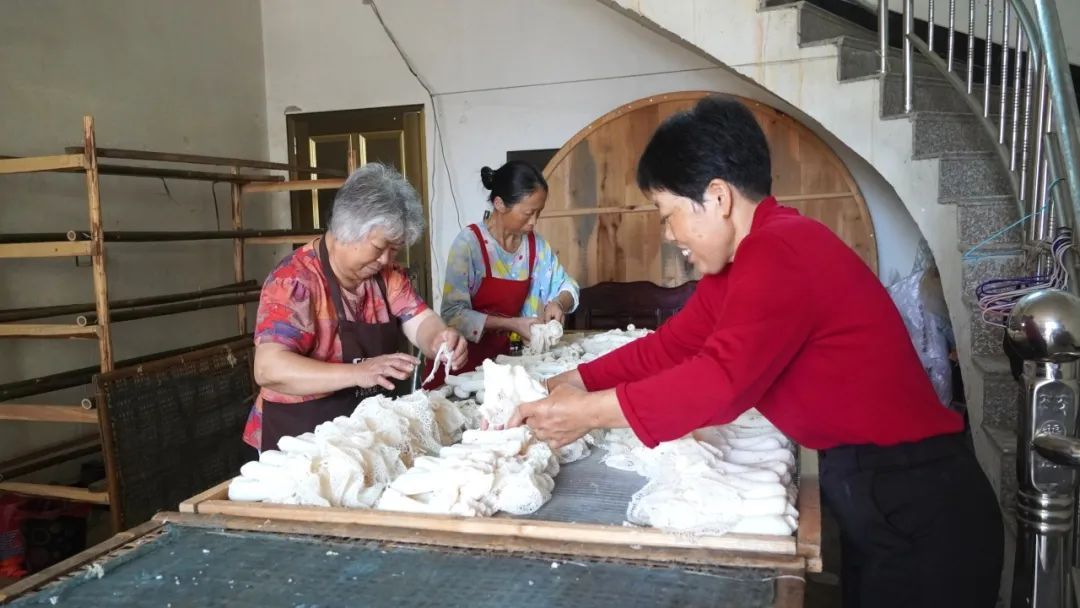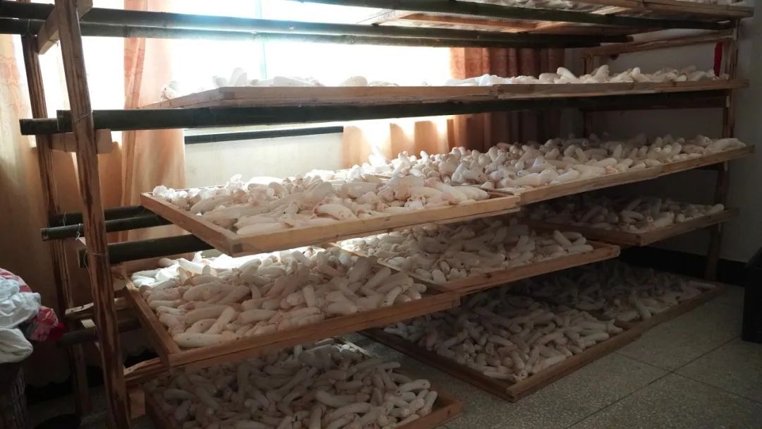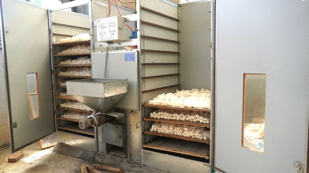 工人正進(jìn)行分揀工作 近年來,臨江鎮(zhèn)積極探索多元化發(fā)展路徑,除了傳統(tǒng)的鮮品銷售,還建成了烘干間,開發(fā)出竹蓀干貨等產(chǎn)品。采摘下來的竹蓀被整齊擺放在烘干間的多層烘干架上,每一層都保持著均勻的間距,確保竹蓀受熱均勻。烘干后的竹蓀,不僅保留了原有的營(yíng)養(yǎng)成分,還更便于儲(chǔ)存和運(yùn)輸。“經(jīng)過烘烤的竹蓀,香氣更加濃郁,在市場(chǎng)上十分搶手。”工人拿起一朵烘干后的竹蓀展示,原本蓬松的竹蓀變得緊實(shí),菌裙依然舒展,泛著自然的米白色。 “今年山后村竹蓀畝產(chǎn)干貨可達(dá)180斤,市場(chǎng)價(jià)格約為每斤80元,預(yù)計(jì)今年竹蓀干貨總收入可達(dá)80萬元。”山后村黨支部書記周昌文介紹。