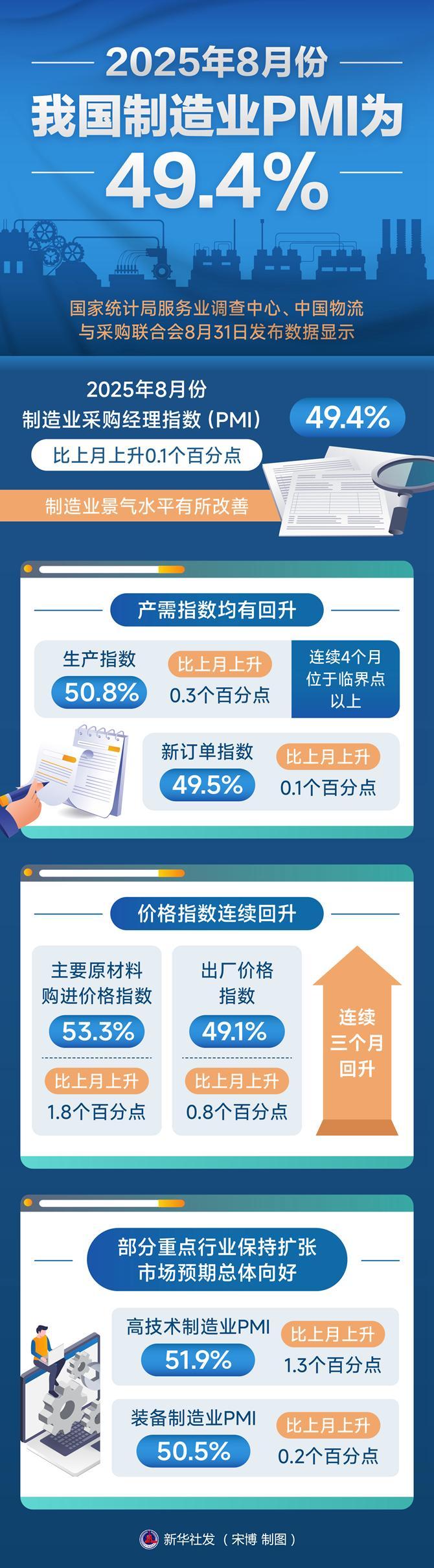 新華社北京8月31日電(記者王雨蕭)國家統(tǒng)計(jì)局服務(wù)業(yè)調(diào)查中心、中國物流與采購聯(lián)合會31日發(fā)布數(shù)據(jù)顯示,8月份制造業(yè)采購經(jīng)理指數(shù)(PMI)為49.4%,比上月上升0.1個(gè)百分點(diǎn),制造業(yè)景氣水平有所改善。 產(chǎn)需指數(shù)均有回升。生產(chǎn)指數(shù)為50.8%,比上月上升0.3個(gè)百分點(diǎn),連續(xù)4個(gè)月位于臨界點(diǎn)以上,制造業(yè)生產(chǎn)擴(kuò)張加快;新訂單指數(shù)為49.5%,比上月上升0.1個(gè)百分點(diǎn)。從行業(yè)看,醫(yī)藥、計(jì)算機(jī)通信電子設(shè)備等行業(yè)生產(chǎn)指數(shù)和新訂單指數(shù)均明顯高于制造業(yè)總體,產(chǎn)需較快釋放;紡織服裝服飾、木材加工及家具、化學(xué)原料及化學(xué)制品等行業(yè)兩個(gè)指數(shù)均低于臨界點(diǎn),產(chǎn)需仍顯不足。在制造業(yè)生產(chǎn)回升的帶動下,近期企業(yè)采購活動有所加快,采購量指數(shù)升至50.4%。 此外,價(jià)格指數(shù)連續(xù)回升,主要原材料購進(jìn)價(jià)格指數(shù)和出廠價(jià)格指數(shù)分別為53.3%和49.1%,比上月上升1.8和0.8個(gè)百分點(diǎn),連續(xù)三個(gè)月回升,制造業(yè)市場價(jià)格總體水平繼續(xù)改善;大型企業(yè)PMI為50.8%,比上月上升0.5個(gè)百分點(diǎn),連續(xù)4個(gè)月高于臨界點(diǎn),擴(kuò)張步伐有所加快。 部分重點(diǎn)行業(yè)保持?jǐn)U張,市場預(yù)期總體向好。高技術(shù)制造業(yè)和裝備制造業(yè)PMI分別為51.9%和50.5%,比上月上升1.3和0.2個(gè)百分點(diǎn),支撐引領(lǐng)作用持續(xù)增強(qiáng);生產(chǎn)經(jīng)營活動預(yù)期指數(shù)為53.7%,比上月上升1.1個(gè)百分點(diǎn),連續(xù)兩個(gè)月回升,表明多數(shù)制造業(yè)企業(yè)對未來市場信心有所增強(qiáng)。 “8月份,制造業(yè)采購經(jīng)理指數(shù)(PMI)、非制造業(yè)商務(wù)活動指數(shù)和綜合PMI產(chǎn)出指數(shù)分別為49.4%、50.3%和50.5%,比上月上升0.1、0.2和0.3個(gè)百分點(diǎn),三大指數(shù)均有所回升,我國經(jīng)濟(jì)景氣水平總體繼續(xù)保持?jǐn)U張。”國家統(tǒng)計(jì)局服務(wù)業(yè)調(diào)查中心高級統(tǒng)計(jì)師趙慶河說。