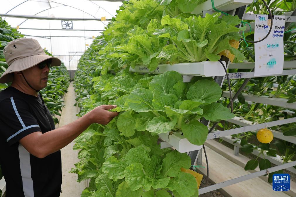 11月3日,在文萊斯里巴加灣市郊一處農(nóng)業(yè)科技產(chǎn)業(yè)園,來(lái)自中國(guó)寧夏回族自治區(qū)固原市的農(nóng)業(yè)技術(shù)專家李繼華查看用水培技術(shù)種植的蔬菜的生長(zhǎng)情況。 近年來(lái),文萊政府不斷深化與中國(guó)在農(nóng)業(yè)領(lǐng)域的交流合作。在文萊斯里巴加灣市郊一處農(nóng)業(yè)科技產(chǎn)業(yè)園,通過(guò)中國(guó)沙培技術(shù)成功種植的網(wǎng)紋蜜瓜近日喜獲豐收,在當(dāng)?shù)厥袌?chǎng)很受歡迎。此外,該產(chǎn)業(yè)園還利用中國(guó)先進(jìn)農(nóng)業(yè)技術(shù)及農(nóng)業(yè)設(shè)備開(kāi)展草莓、茄子、辣椒等果蔬的培育種植,在為文萊市場(chǎng)提供高品質(zhì)果蔬產(chǎn)品的同時(shí),進(jìn)一步推動(dòng)文萊農(nóng)業(yè)現(xiàn)代化發(fā)展。 新華社記者 李萌 攝