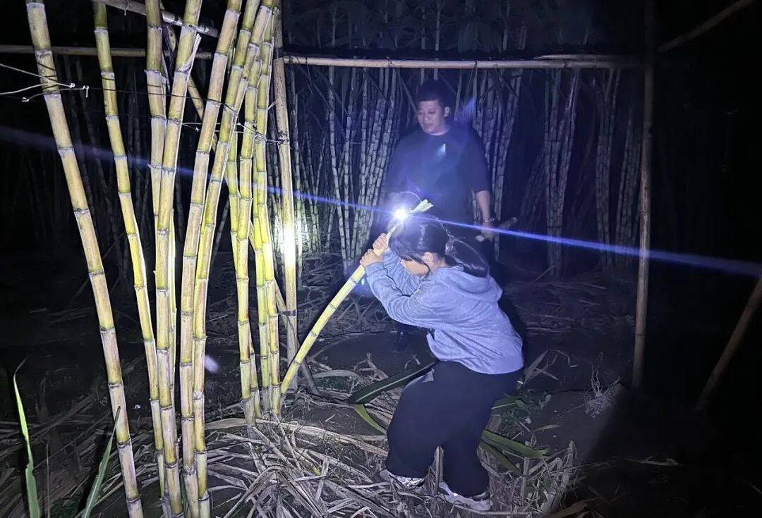“甘蔗奇兵”游戲現場 夜幕下的山橋村文蔗園入口處已聚集了數十名游客。頭燈、小鋤頭、削皮刀,裝備齊全的“蔗夜奇兵”們躍躍欲試,準備潛入這片青綠蔗林展開一場別開生面的“偷蔗”行動。月光下的蔗林沙沙作響,頭燈的光束在夜色中交錯,手起刀落間,一根根甘蔗應聲倒下,歡笑聲回蕩在田野。