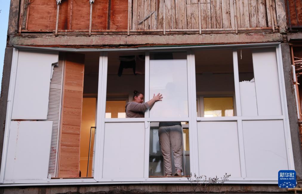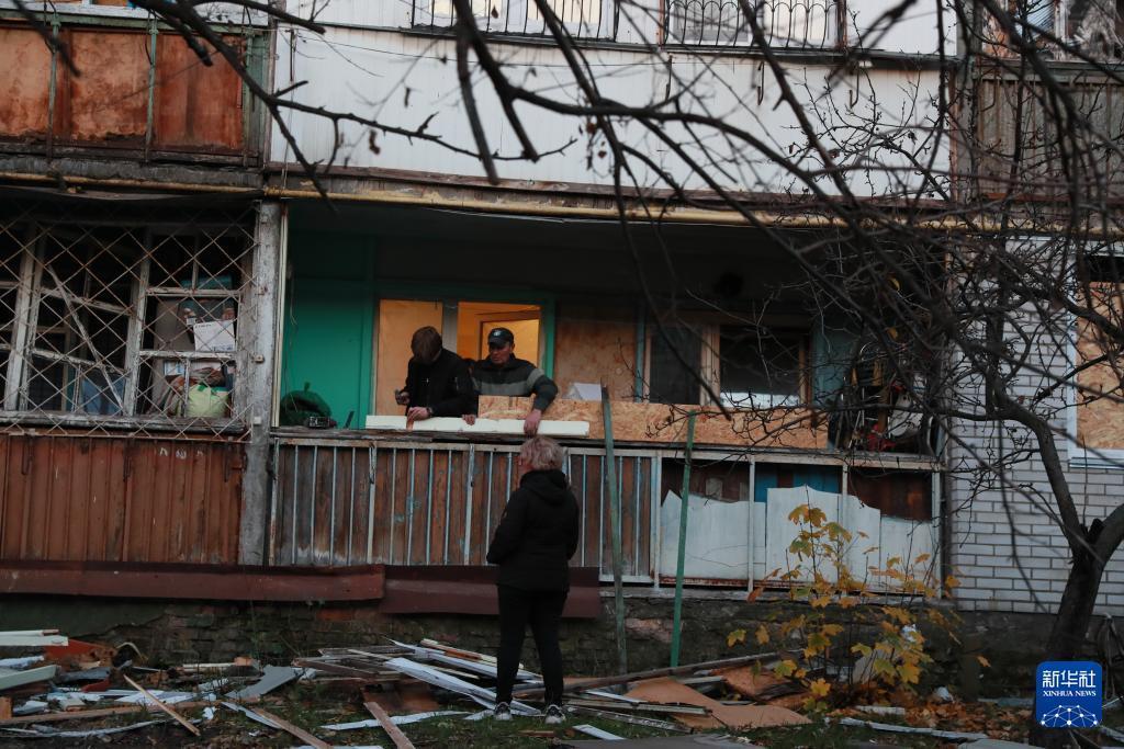 11月14日,在烏克蘭首都基輔市第聶伯區(qū),當?shù)鼐用駥υ馐芸找u損毀的房屋進行修繕加固。 當天凌晨,基輔遭到俄軍大規(guī)模空襲。 新華社記者 李東旭 攝