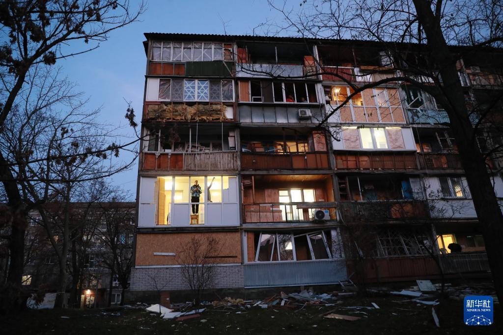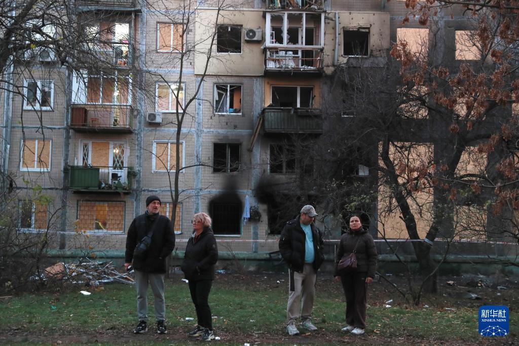 11月14日,在烏克蘭首都基輔市第聶伯區(qū),當?shù)鼐用裾驹谠馐芸找u損毀的房屋前。 當天凌晨,基輔遭到俄軍大規(guī)模空襲。 新華社記者 李東旭 攝