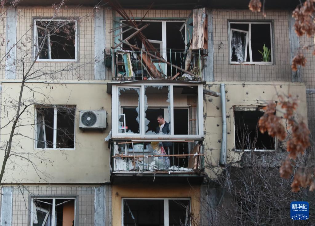 11月14日,在烏克蘭首都基輔市第聶伯區(qū),當?shù)鼐用駥υ馐芸找u損毀的房屋進行清理。 當天凌晨,基輔遭到俄軍大規(guī)模空襲。 新華社記者 李東旭 攝 |