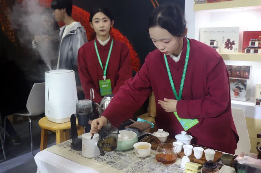 展示茶道技藝 “浦城丹桂花茶,底蘊深厚,創新十足。”孫威江在細致品鑒了多款產品后指出,浦城充分利用“中國丹桂之鄉”的資源優勢和獨特的非遺窨制技藝,成功打造了丹桂紅茶、白茶、烏龍茶等系列產品,其香氣馥郁、茶湯甘醇、滋味融合度高的特點,正是“三茶”統籌理念的生動實踐。 “大口窯青白瓷與丹桂花茶的同臺展示,構成了‘茶器相映’的雅致格局,極大提升了產品的文化附加值?!蹦敲矗鎸Ξa業高質量發展的新要求,浦城茶產業該如何突破?孫威江建議,浦城應繼續在“標準”與“科技”上雙輪驅動,要建立丹桂花茶的感官品質與理化成分標準體系,用科學數據定義好茶風味;要深化窨制工藝機理研究,利用科技手段穩定并提升品質,讓公共品牌走得更遠、更穩。