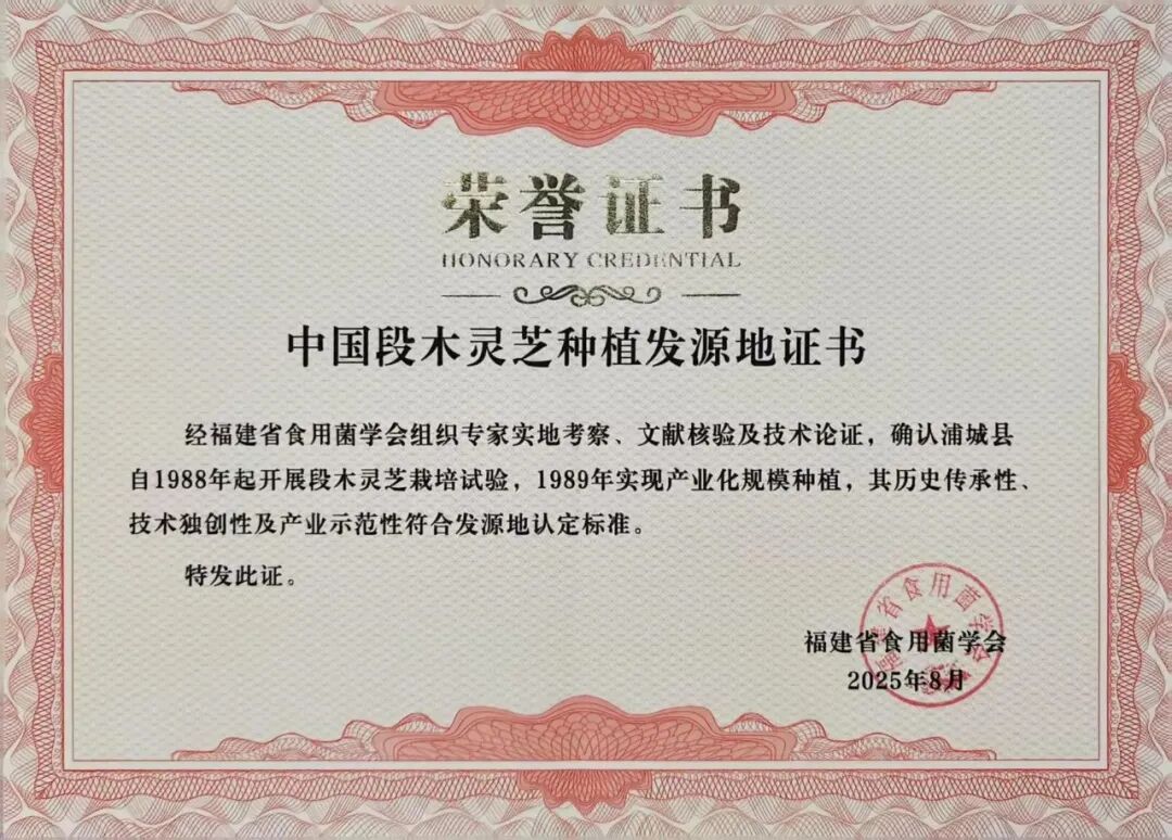 11月15日,在福州舉辦的2025年全國第十三屆(福州)藥用真菌學術研討會上,浦城縣被正式授予“中國段木靈芝種植發源地”稱號,標志著浦城縣在段木靈芝種植歷史、技術傳承與產業規模等方面的領先地位獲得權威認可。