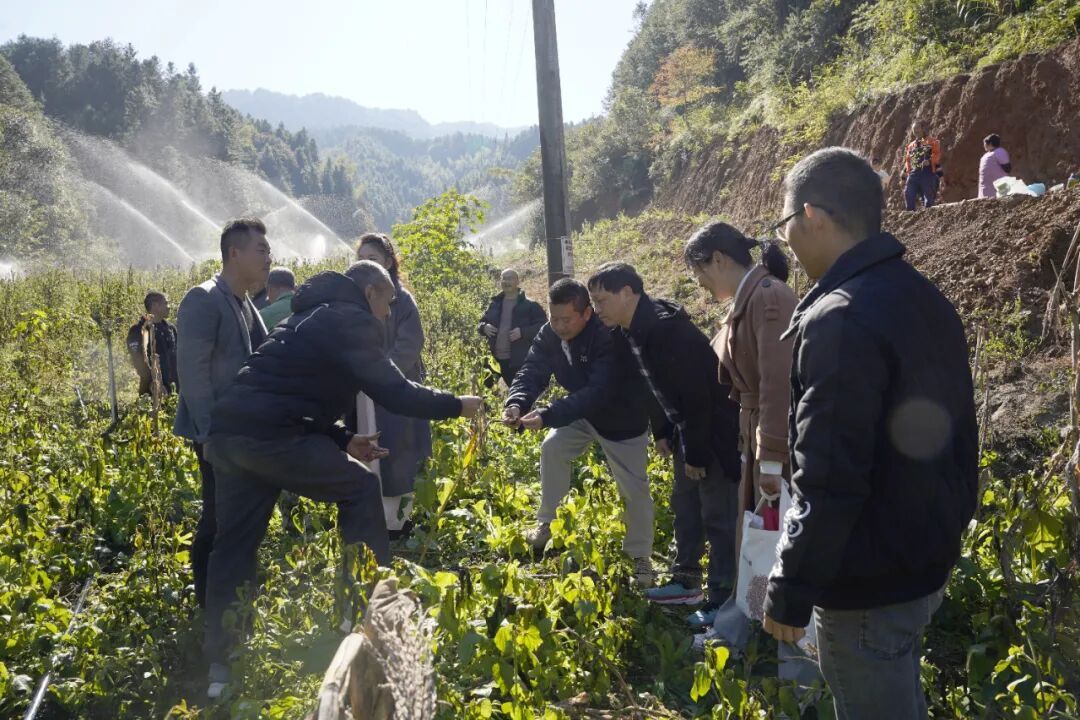現場講解黃精種植技術 伴隨著山壟田泥土芬芳,30余畝黃精在陽光下舒展,黑色的噴灌管道在田間有序鋪展,細密的水珠正均勻灑落在田間。劉福陽俯身在田間,不時撥開土壤查看根系生長情況:“黃精喜濕但怕澇,山壟田坡度大、排水快。噴灌能精準控制每畝地的用水量,還能避免根系腐爛,尤其是今年下半年干旱期,通過噴灌保障了水分供給,極大減少了人工成本。后續還是要做好田間的管理,施加有機肥,確保黃精的生長?!?/span> 觀摩人群中,后洋上篷家庭農場負責人李福榮蹲在田埂上,指著長勢喜人的黃精向眾人介紹,“以前全靠天吃飯,旱天澆不透、雨天澇死苗,黃精管理全靠人工。多虧劉老師建議加裝噴灌系統,現在我在家門口點開APP,手指一滑就能開始澆水,都不用下田呢。”說完,他上前拉住劉福陽請教黃精深加工問題,專家當場給出了建議。
