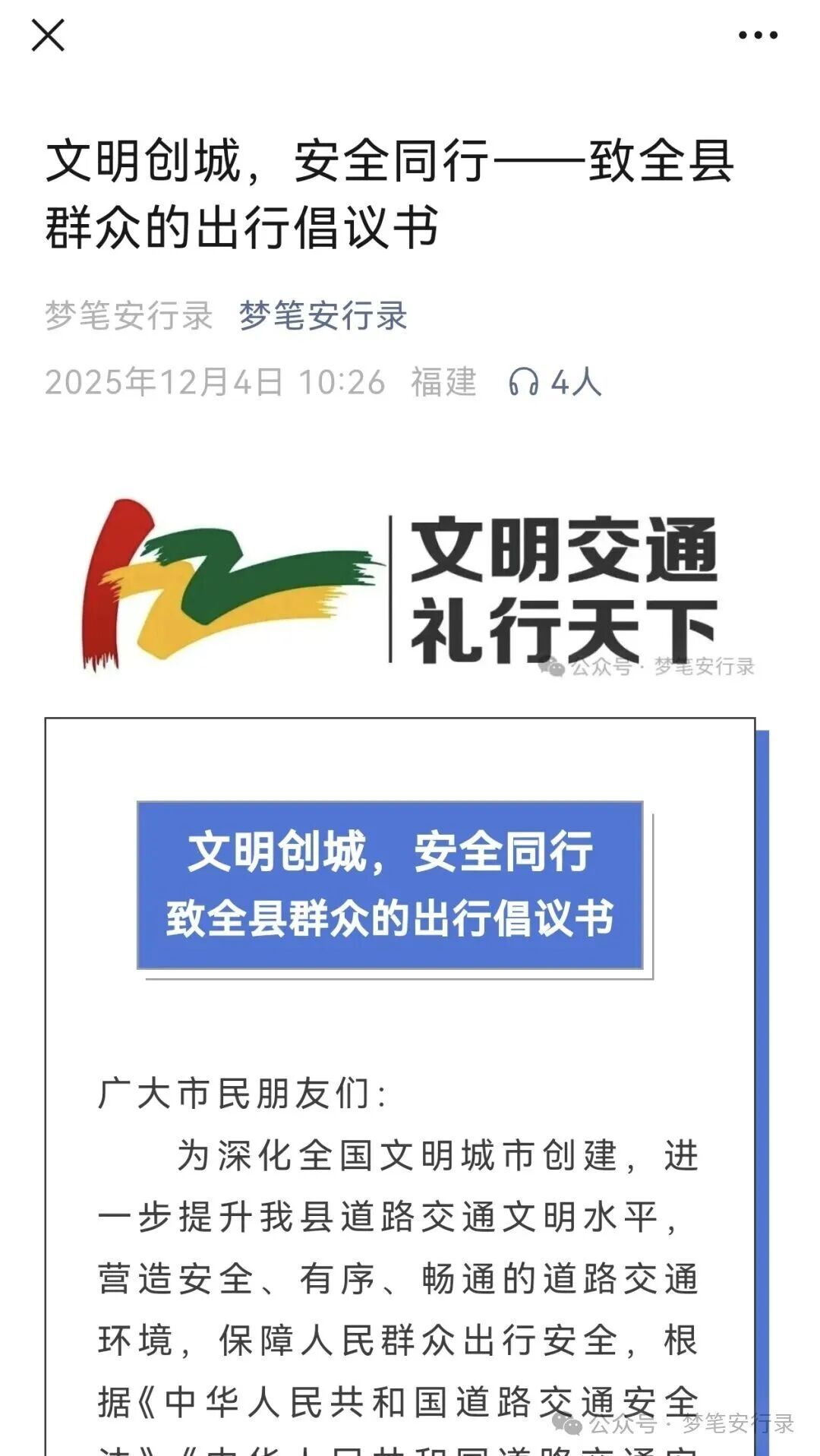 此外,大隊充分利用微信公眾號定期發布交通安全提示、違法行為曝光、典型案例剖析。近日,還通過公眾號向全縣群眾發布了一封《文明創城,安全同行》的出行倡議書,呼吁全體交通參與者攜手共同維護安全、文明、和諧的道路交通環境。 浦城公安交警在此呼吁 希望每一位市民,從自身做起 從每一次出行做起 開文明車、行文明路、做文明人 共同為創建文明城市貢獻一份力量