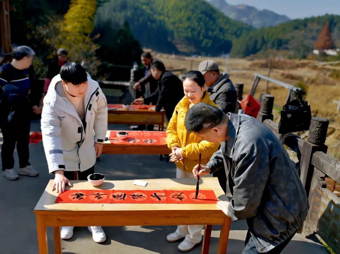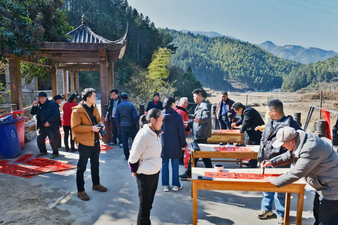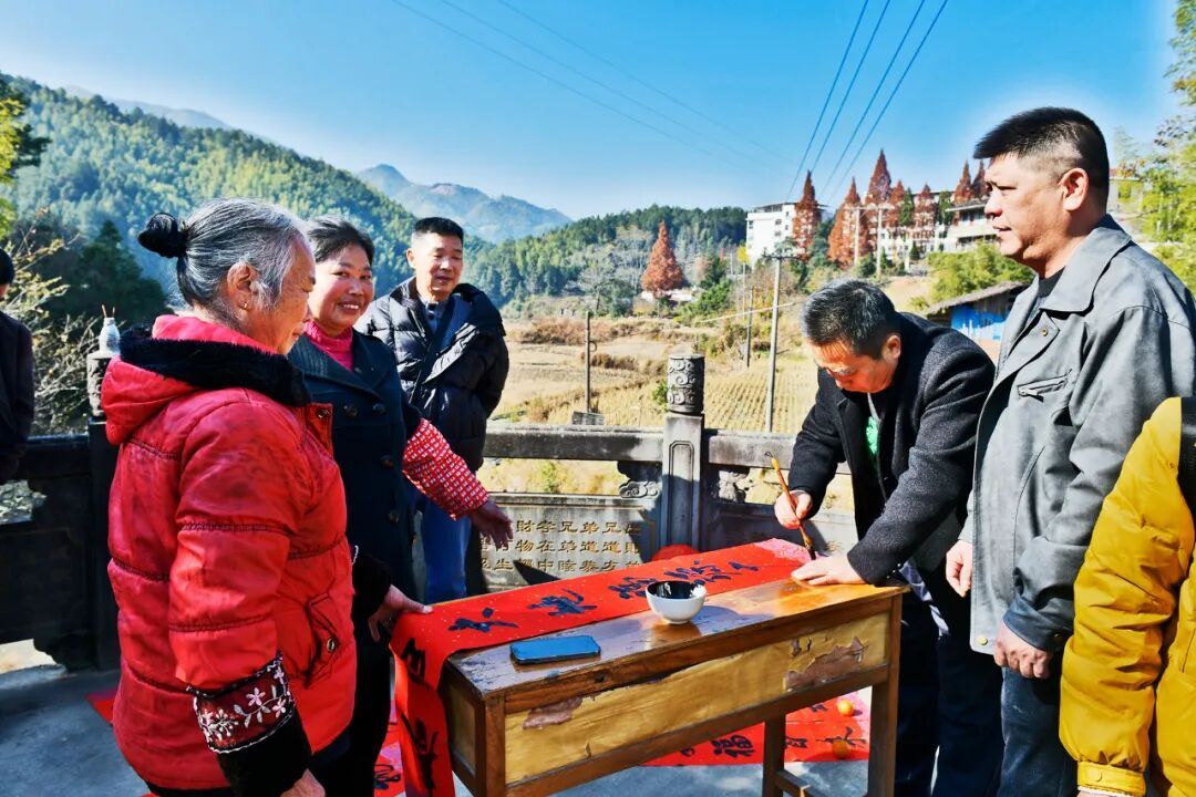 氧8茗宿風(fēng)光 紅紙迎春,筆走福至 清晨,霜花未化,楓溪街廊橋上,長桌一字排開,紅紙翻飛,墨香蒸騰。書法家們站筆懸腕,一副副春聯(lián)一氣呵成——“楓染千山醉,溪涵萬象新”“山抱古村春早到,門迎福字日長紅”。老鄉(xiāng)們捧著還飄著墨香的“福”字,迫不及待就地晾曬,廊橋瞬間成了紅色海洋。不到兩小時(shí),百來副春聯(lián)被“認(rèn)領(lǐng)”一空。